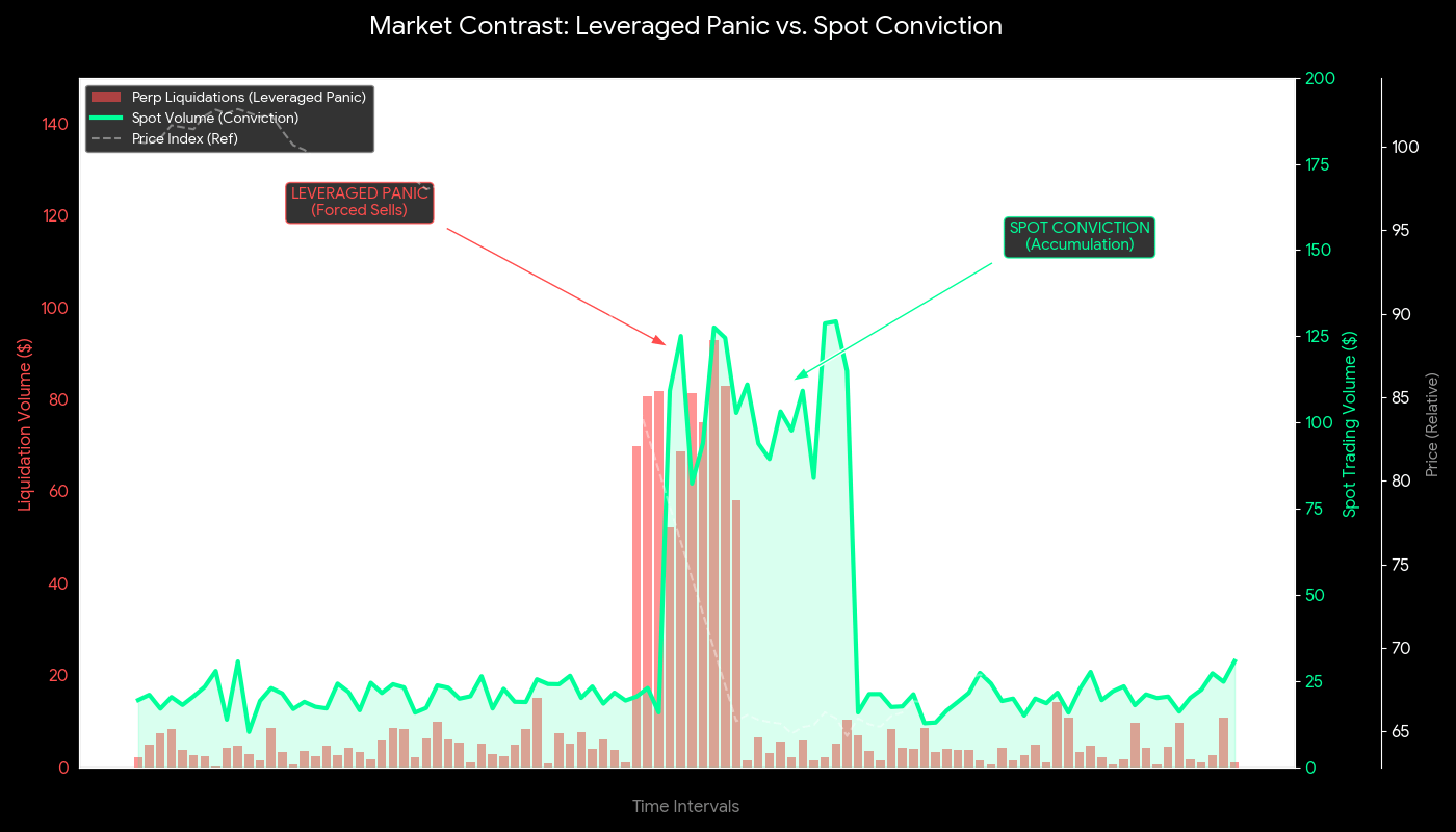 Beobachten Sie den Unterschied zwischen Spotkäufen und perpetual Futures. Spotansammlungen zeigen Überzeugung: Diese Akteure halten langfristig. Perpetuelle Händler hingegen verstärken die Preisschwankungen mit Hebelwirkung und beschleunigen oft die Panikverkäufe. Wenn das Spotvolumen steigt, während die perpetual Longs liquidiert werden, ist das eine klassische Ansammelphase.