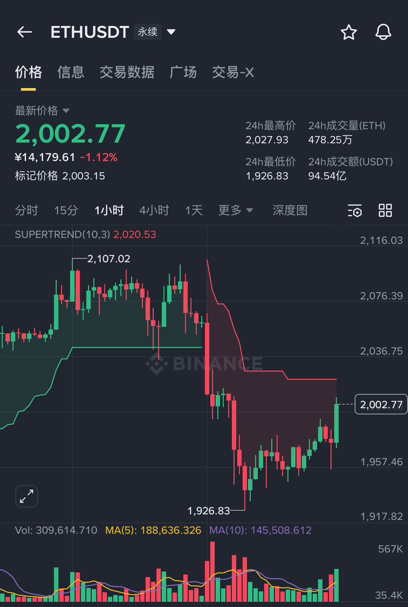 * ETH (2,007): 苟延残喘。虽然没有跌破 1,926 的前低,也收复了 2,000,但整体走势依然被 SuperTrend (2,038) 死死压制。现在的反弹更像是跟随大饼的被动上涨,一旦大饼回调,ETH 可能会跌得更惨。