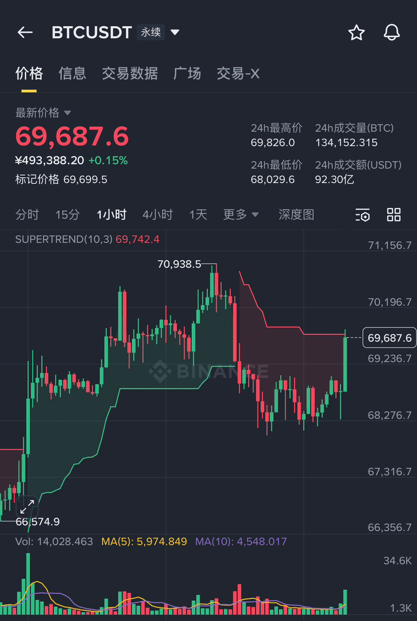 看看这根大阳线,是不是觉得牛回速归了?且慢! BTC 从 68,000 拉到 69,687,看似凶猛,实则正好卡在 SuperTrend 阻力线 (69,742) 的喉咙口。