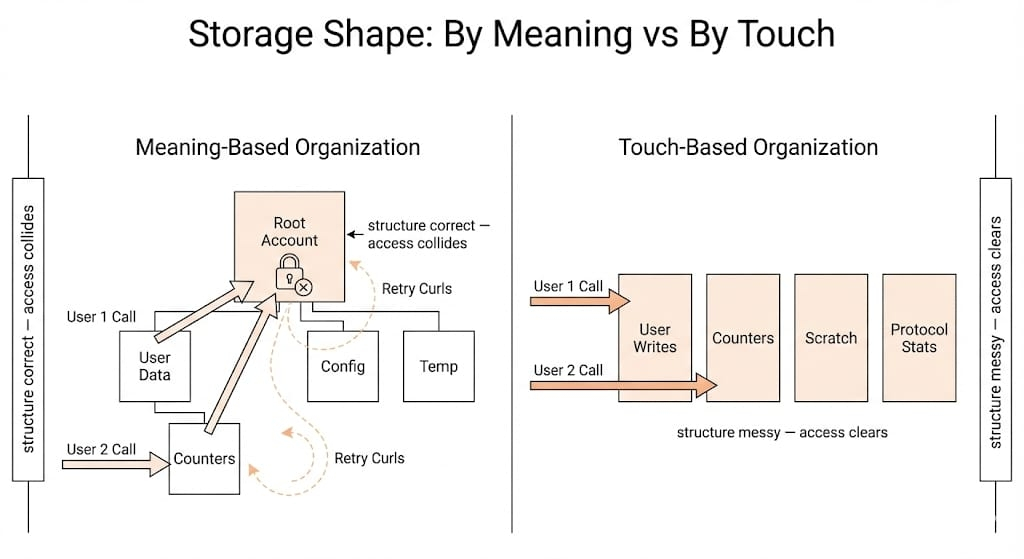 I stopped thinking about "state" as a place. Started thinking about it as traffic. Which paths could run parallel and which merged into single lanes. The contract state layout became a map of possible collisions. I drew it on paper, actual paper, arrows showing which accounts touched which. The dense clusters were obvious once I looked. Obvious and embarrassing.