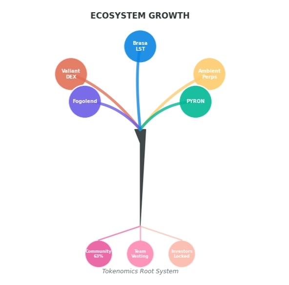 Ecosystem development shows early promise. Valiant offers hybrid DEX infrastructure combining order books with concentrated liquidity. Ambient Finance pioneers perpetual futures through batch auctions designed to minimize MEV. Fogolend and PYRON address capital efficiency through lending markets, while Brasa enables liquid staking. Infrastructure partners like Wormhole, Birdeye, and Solscan provide essential connectivity and analytics.