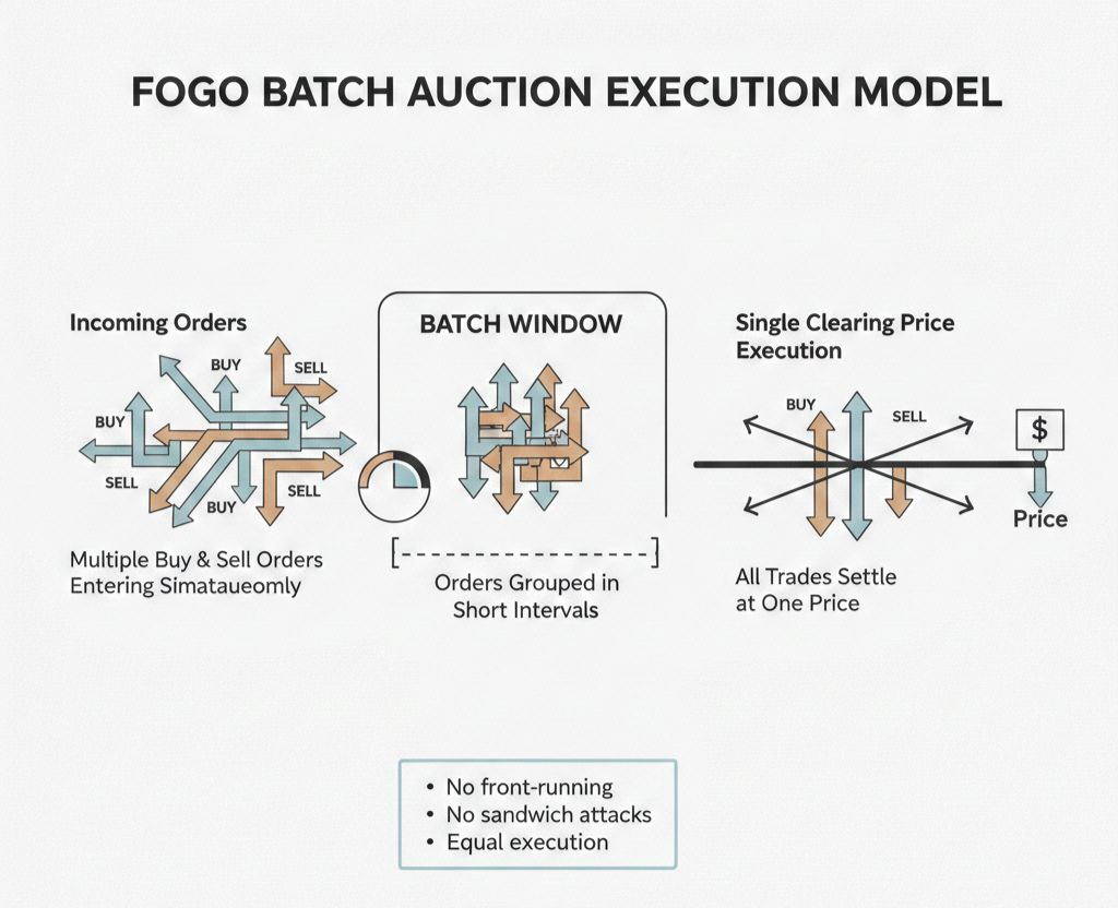 Fogo solved it by refusing to process trades continuously. Instead, Ambient batches incoming orders over short intervals—usually a few hundred milliseconds—and executes them all simultaneously at a single clearing price. No transaction goes first. No bot can see your order and sandwich it because there's no "before" and "after" within the batch. Everyone in the batch gets the same price, determined by the balance of buy and sell pressure across all orders. That's not just different execution mechanics. It's different economics.