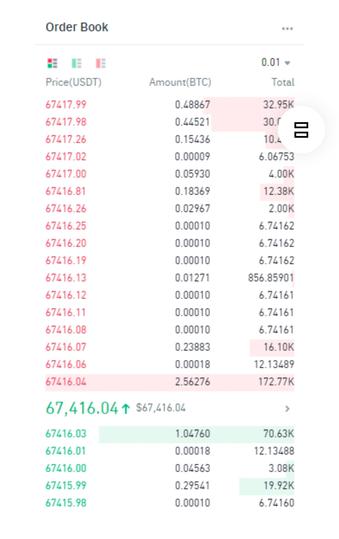 On Binance Web, the order book is located on either the left or right side of your trading interface (left side for Spot and Margin; right side for Futures). It looks like this: