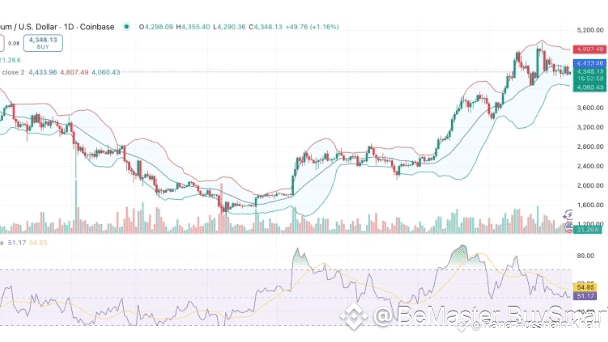 Die Charts erzählen ihre eigene Geschichte. Die Bollinger-Bänder von Ethereum ziehen sich zusammen, was oft kurz vor einer großen Bewegung passiert. Der RSI liegt schön bei 51 - nicht zu heiß, nicht zu kalt.