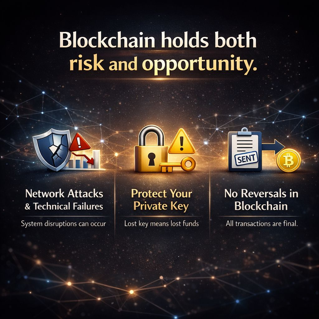 Sabse pehle baat aati hai blockchain risk ki. Blockchain ko aam taur par bahut secure mana jata hai, lekin iska matlab ye nahi ki ye kabhi attack ka shikar nahi ho sakta. Agar kisi din network par majority attack ho jaye, ya koi technical fault aa jaye, to transactions ruk sakti hain ya delay ho sakti hain. Socho agar aapne kisi ko token bheja aur system hi thodi der ke liye confuse ho gaya. Aise situation me price gir sakta hai aur log panic bhi kar sakte hain. Ye darane ke liye nahi, balki sach batane ke liye likha jata hai.