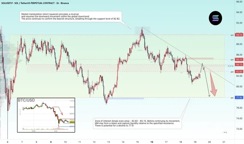 Market manipulation (short squeeze) provokes a reversal and resumes the downward movement within the global downtrend. The price continues to confirm the bearish structure, breaking through the support level of 82.82.