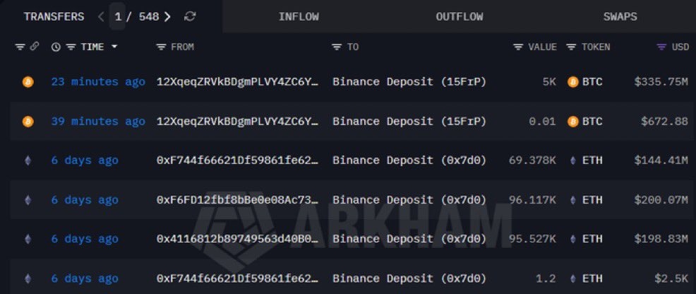 Ein Bitcoin-Wal hat gerade 5.000 BTC (~335 Millionen USD) Minuten bevor die US Q4 BIP-Daten veröffentlicht wurden, zu Binance bewegt.