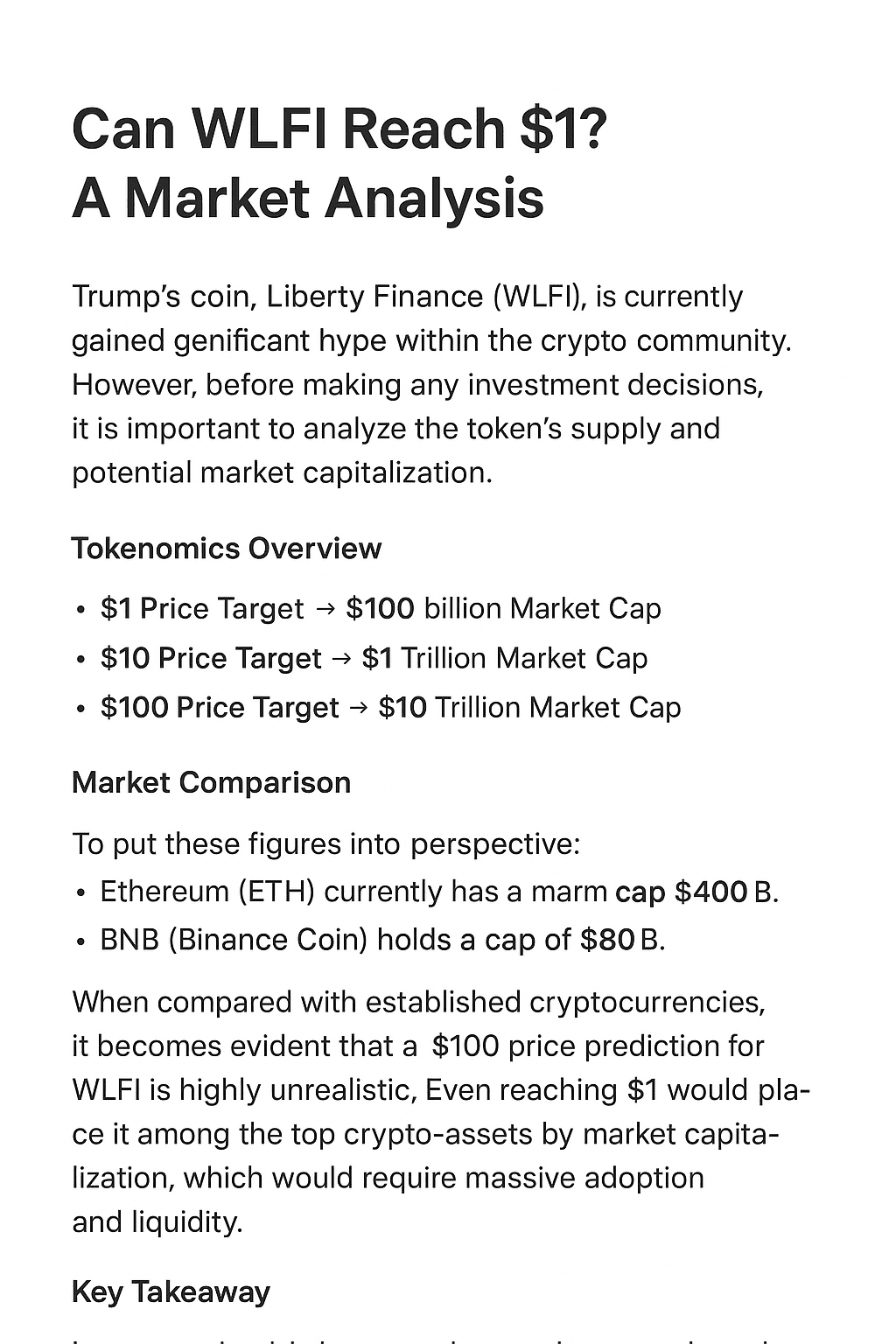 Im Vergleich zu etablierten Kryptowährungen wird deutlich, dass eine Preisprognose von 100 $ für WLFI äußerst unrealistisch ist. Selbst 1 $ zu erreichen, würde es unter die Top-Krypto-Assets nach Marktkapitalisierung bringen, was massive Akzeptanz und Liquidität erfordern würde.