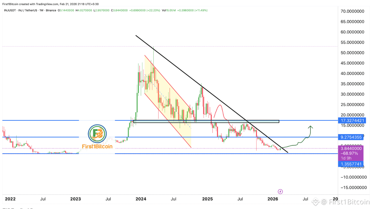 Injective wird nahe einer wichtigen langfristigen Unterstützung gehandelt, nachdem es einen längeren Abwärtstrend gegeben hat.