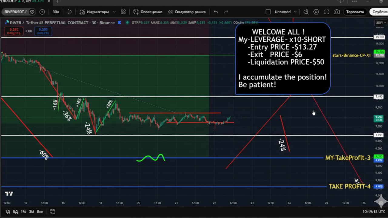Das Diagramm zeigt RIVER/USDT Perpetual (30-Minuten-Zeitrahmen) auf Binance und hebt eine fettgedruckte x10 Hebel-Short-Position hervor. Der Trader hat einen klaren Plan mit definierten Ein-, Aus- und Liquidationslevels skizziert — was Vertrauen in eine breitere bärische Aussicht suggeriert.