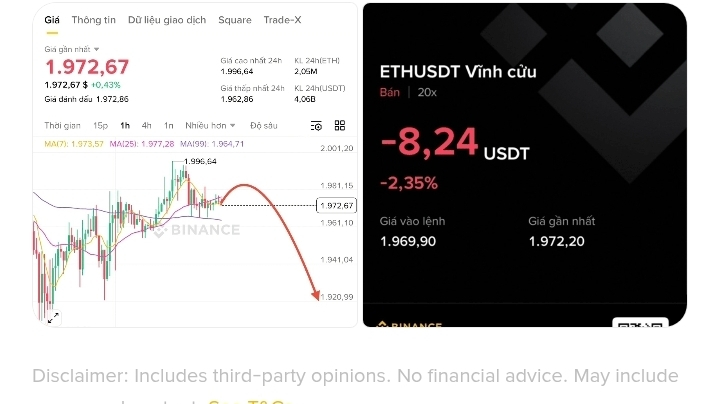 $ETH is drifting into supply, but momentum is fading. Entry: 1955–1990, SL 2070, TP1 1865, TP2 1790, TP3 1710. Each rally is sold into, buyers fail to continue, and sellers defending this zone point to likely downside rotation.