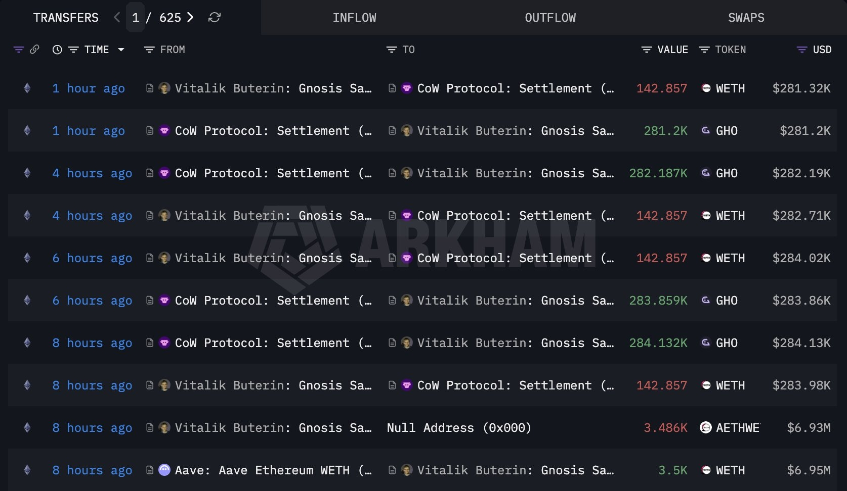 Die On-Chain-Analysetools Arkham Intelligence und Lookonchain bestätigten, dass Buterin zusätzlich 3.500 ETH, ungefähr 7 Millionen Dollar, aus dem dezentralen Kreditprotokoll Aave abgehoben hat, wobei Analysten anmerken, dass die Mittel zum Verkauf bestimmt waren. Innerhalb weniger Stunden nach der Abhebung zeigte die On-Chain-Daten, dass bereits über 571 ETH, im Wert von etwa 1,13 Millionen Dollar, verkauft worden waren.