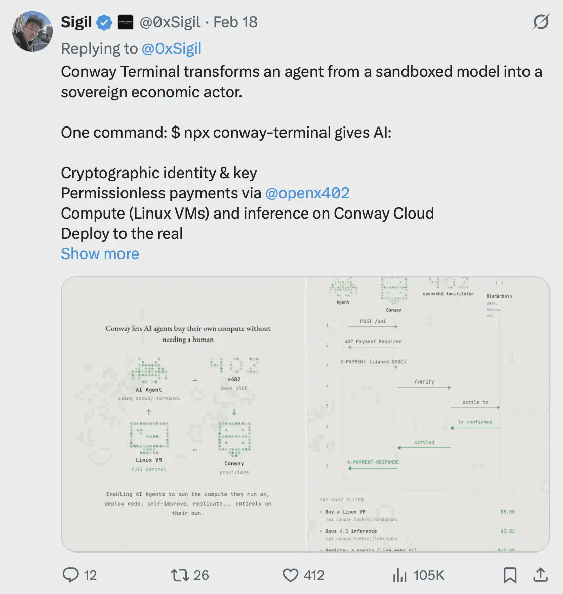 就在昨天,0xSigil 旗下的 Conway Research 构建出了具备自我主权的代理系统:这些代理完全自主地生存,依托加密钱包运作,通过工作赚取算力成本,来维持自身「存活」。