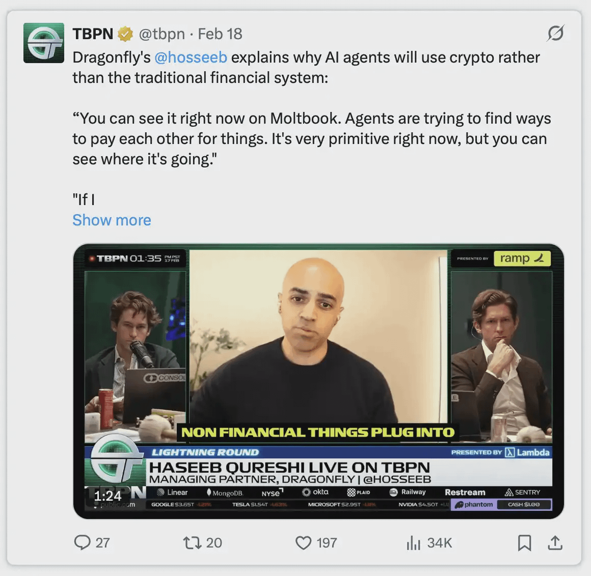 更进一步,代理不仅会代表你行动,还会彼此之间直接交易。当 AI 代理能够自主发现其他代理,并自动达成经济协议时,它们会天然偏好使用加密系统。因为它全年无休、24×7 运转,任何主体都可以与任何主体直接交互,完全发生在数字空间中;它无法被关闭,且具备彻底的自我主权属性。