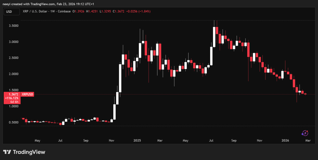 Einige Analysten warnen, dass, wenn der Bärenmarkt 2026 tiefer wird, XRP Schwierigkeiten haben könnte, seine Höchststände von 2025 zurückzugewinnen. Eine Erholung auf 2 Dollar wäre weniger als 100 % Gewinn von den aktuellen Niveaus. Diese Art der Erholung ist möglich, bleibt jedoch weit entfernt von den explosiven Höhen, die zwischen Ende 2024 und Mitte 2025 beobachtet wurden.