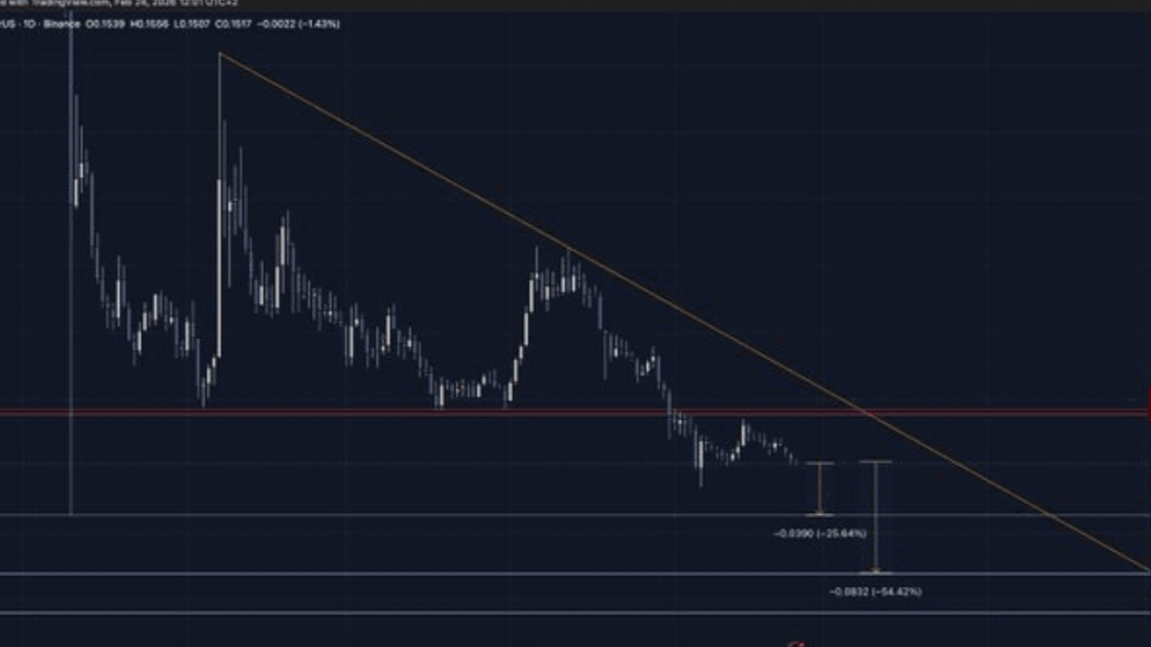 - Preis bei $0.154 nach einem Rückgang von 3,5% in 24 Stunden und einem wöchentlichen Rückgang von 21%.