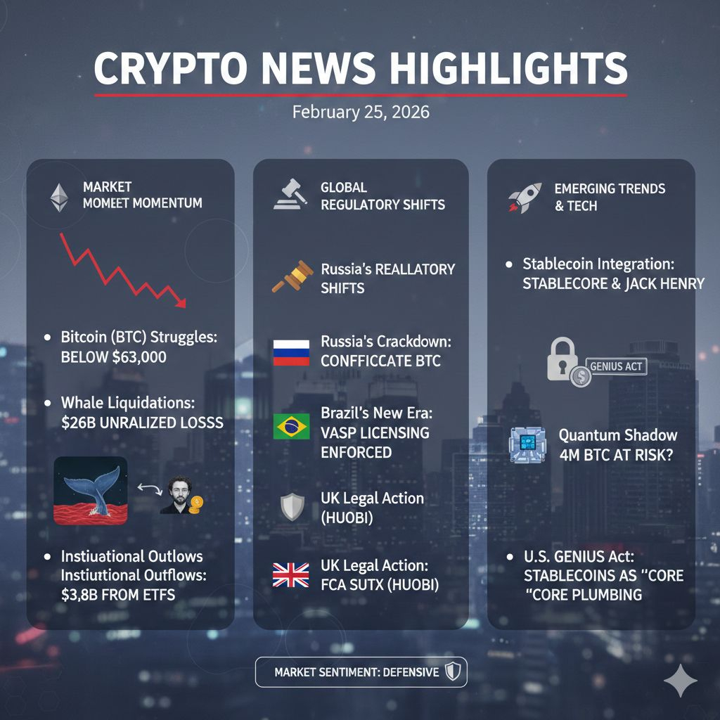 Bitcoin (BTC) Struggles: BTC dipped below the $63,000 mark earlier today, marking a nearly 20% decline for February—its worst monthly performance since 2022. Analysts cite a "crisis of confidence" as the asset has halved in value from its October all-time high.
