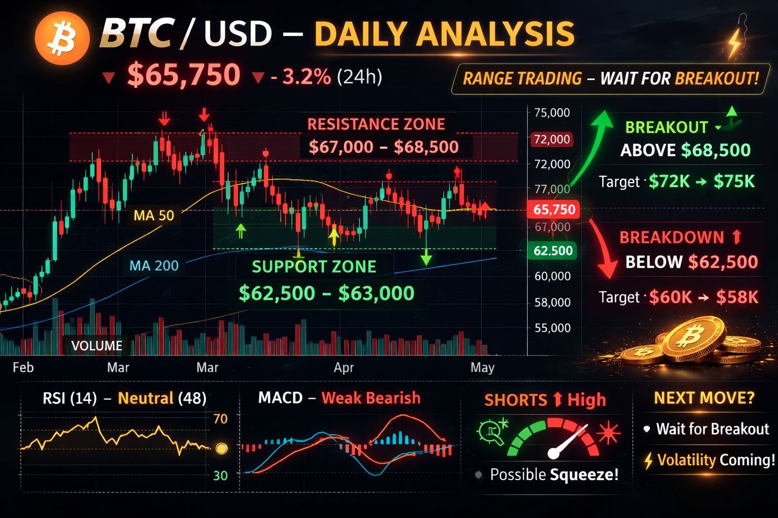 Quick read: BTC is trading in a sideways range right now. If it drops below the support zone, downside could accelerate. Breaking back above the resistance band would improve the short-term tone.