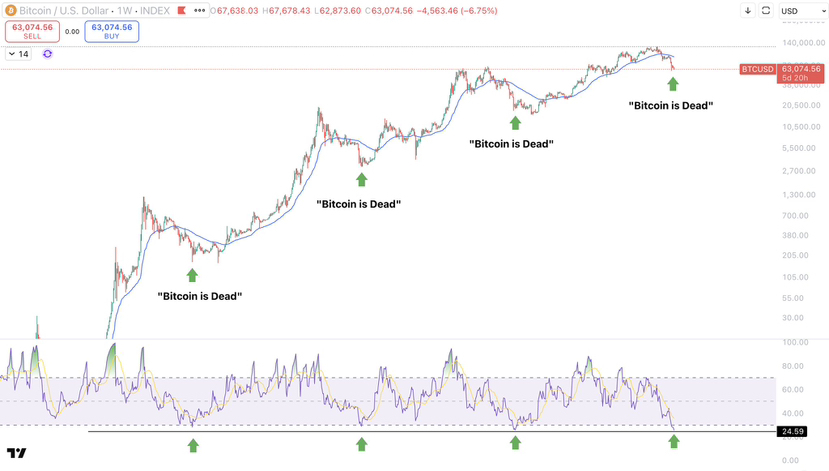 Jedes Mal, wenn Bitcoin extreme wöchentliche Überverkaufslevels erreicht, entfaltet sich dasselbe Muster.