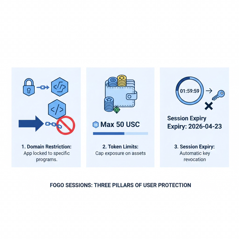 The three pillars of this protection are domain fields, token limits, and expiries. The domain field acts as a digital fence, locking the session to a specific on-chain program address so the app cannot reach outside its sandbox. I also set a strict limit on which tokens the app can touch and the maximum amount it can move. This means I do not have to create a burner wallet or fund it with gas just to test a new tool; I can use my main setup but cap my exposure at 50 USDC. Finally, the session has a hard expiry, so even if I walk away, the window for any potential exploit closes itself automatically.