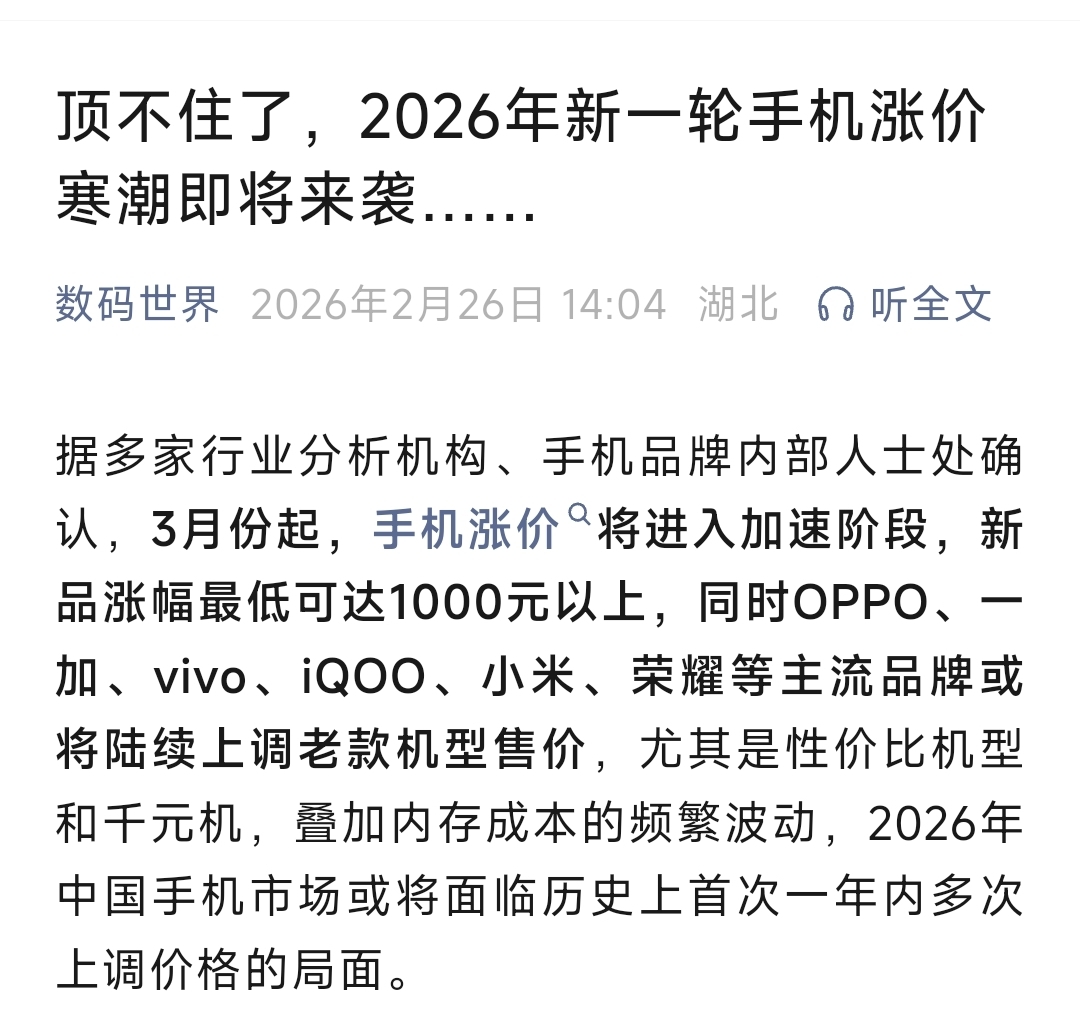 先给没吃到热乎瓜的朋友补个课:3月份开始,咱们熟的OPPO、vivo、小米、荣耀这些主流牌子,不管是新出的机子还是老款,全要涨价!新品最低都要涨1000块,中高端旗舰更狠,直接涨2000-3000,连以前咱们蹲得最多的性价比千元机都跑不掉。不是小道消息瞎传,人家专业机构都实锤了,2026年国内手机涨得比全球都凶,新品比去年同配置的要贵15%-25%,旗舰机涨幅直接破30%,大内存版本涨得最离谱,贵2000都不稀奇。#人工智能