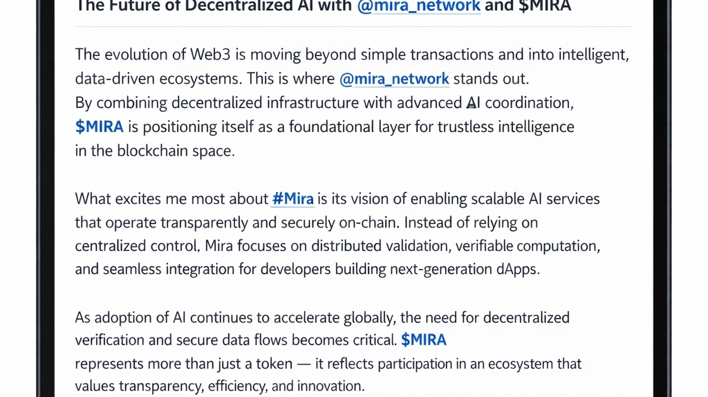 Mit der globalen Beschleunigung der Einführung von KI wird die Notwendigkeit für dezentrale Verifizierung und sichere Datenflüsse entscheidend. $MIRA repräsentiert mehr als nur ein Token – es spiegelt die Teilnahme an einem Ökosystem wider, das Transparenz, Effizienz und Innovation schätzt.