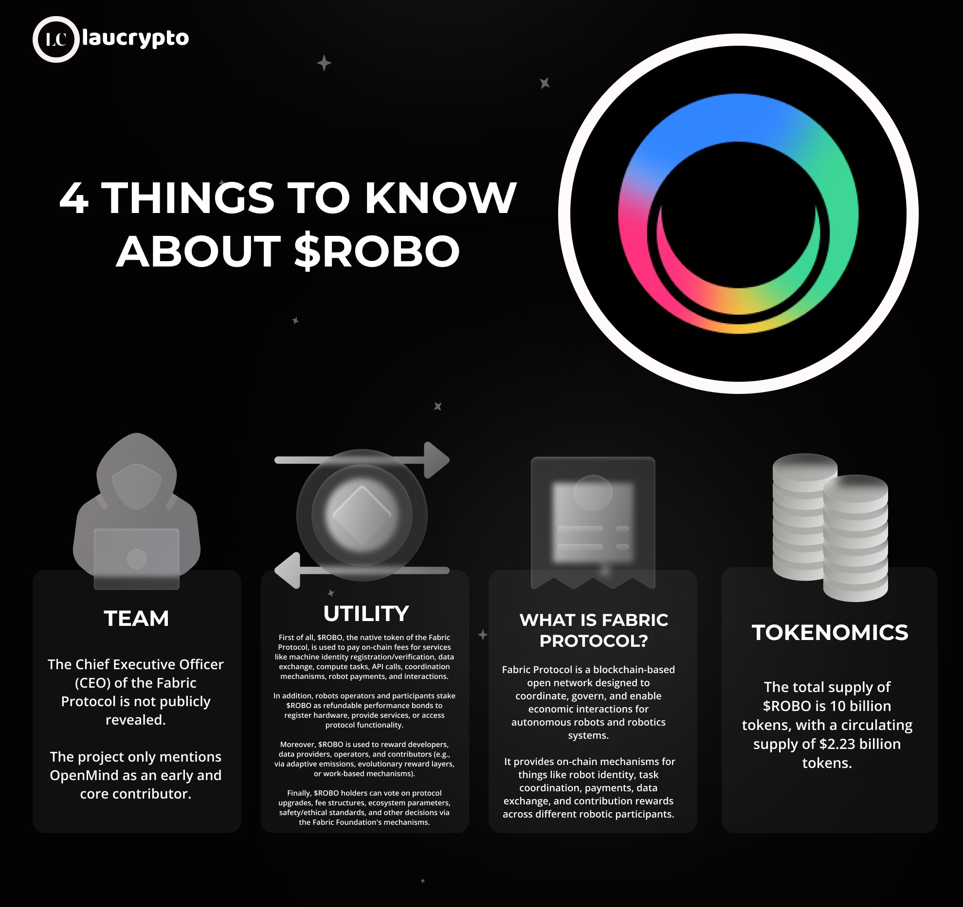 $ROBO é o token nativo do Fabric Protocol, uma rede aberta baseada em blockchain que permite que robôs e máquinas autônomas se identifiquem, coordenem tarefas, troquem dados e sejam remunerados sem uma autoridade central.