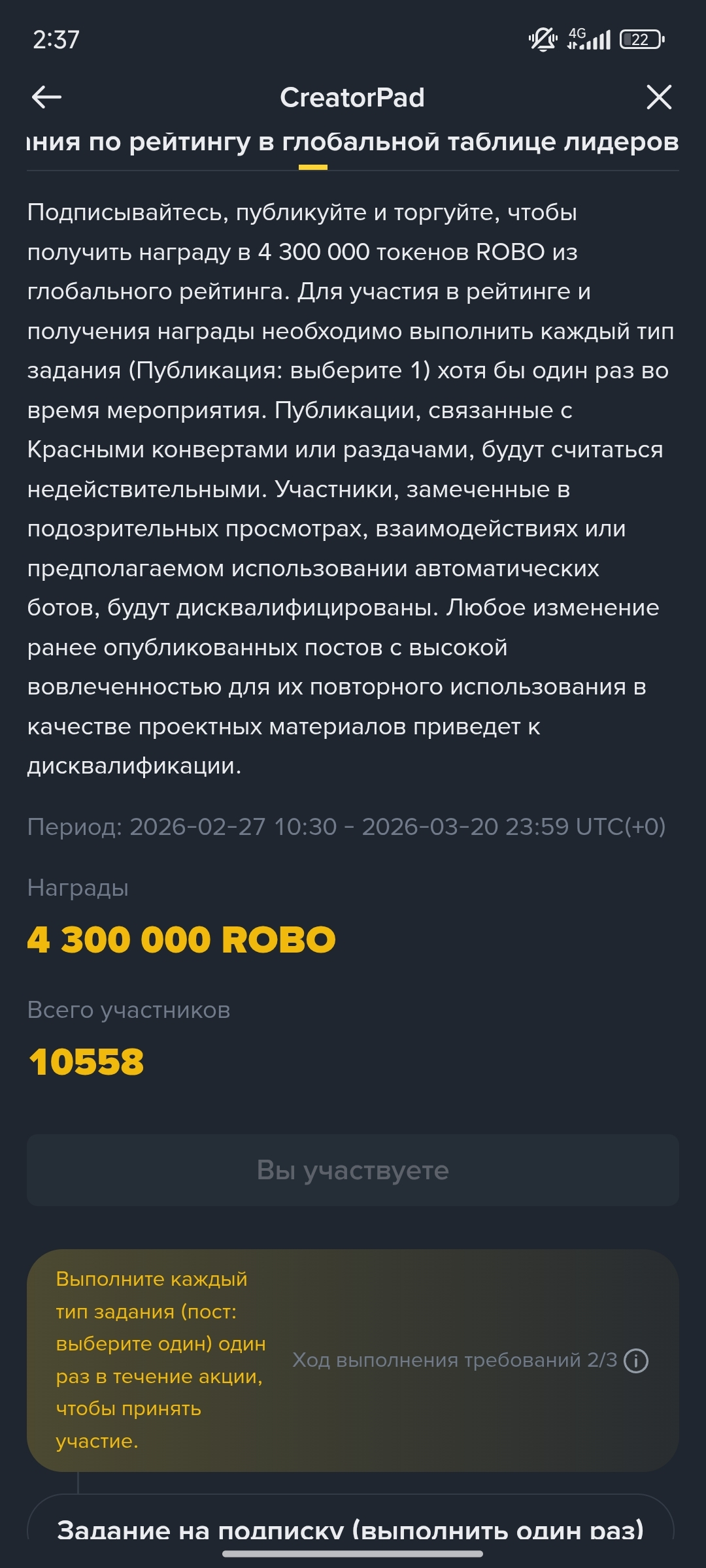 Подписывайтесь, публикуйте и торгуйте, чтобы получить награду в 4 300 000 токенов ROBO из глобального рейтинга. Для участия в рейтинге и получения награды необходимо выполнить каждый тип задания (Публикация: выберите 1) хотя бы один раз во время мероприятия. Публикации, связанные с Красными конвертами или раздачами, будут считаться недействительными. Участники, замеченные в подозрительных просмотрах, взаимодействиях или предполагаемом использовании автоматических ботов, будут дисквалифицированы. Любое изменение ранее опубликованных постов с высокой вовлеченностью для их повторного использования в качестве проектных материалов приведет к дисквалификации.
