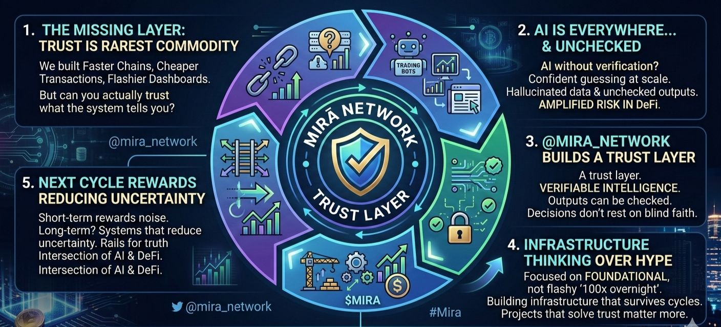 Instead of chasing hype cycles, #Mira is focused on something foundational: verifiable intelligence. Making sure outputs can be checked. Making sure decisions built on AI don’t rest on blind faith. That’s not flashy. It doesn’t scream “100x overnight.” But it’s infrastructure thinking — and infrastructure is what survives cycles.