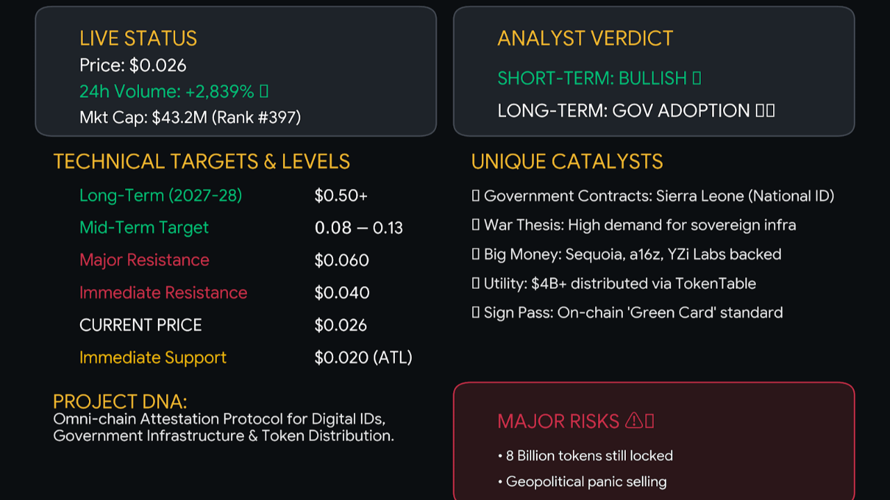 $SIGN handelt derzeit bei ~$0.026 USD, +13,63 % in den letzten 24 Stunden, auf Platz #397 bei CoinMarketCap mit einer aktuellen Marktkapitalisierung von 43,2 Millionen USD und einem umlaufenden Angebot von 1,64 Milliarden SIGN von einem maximalen Angebot von 10 Milliarden.