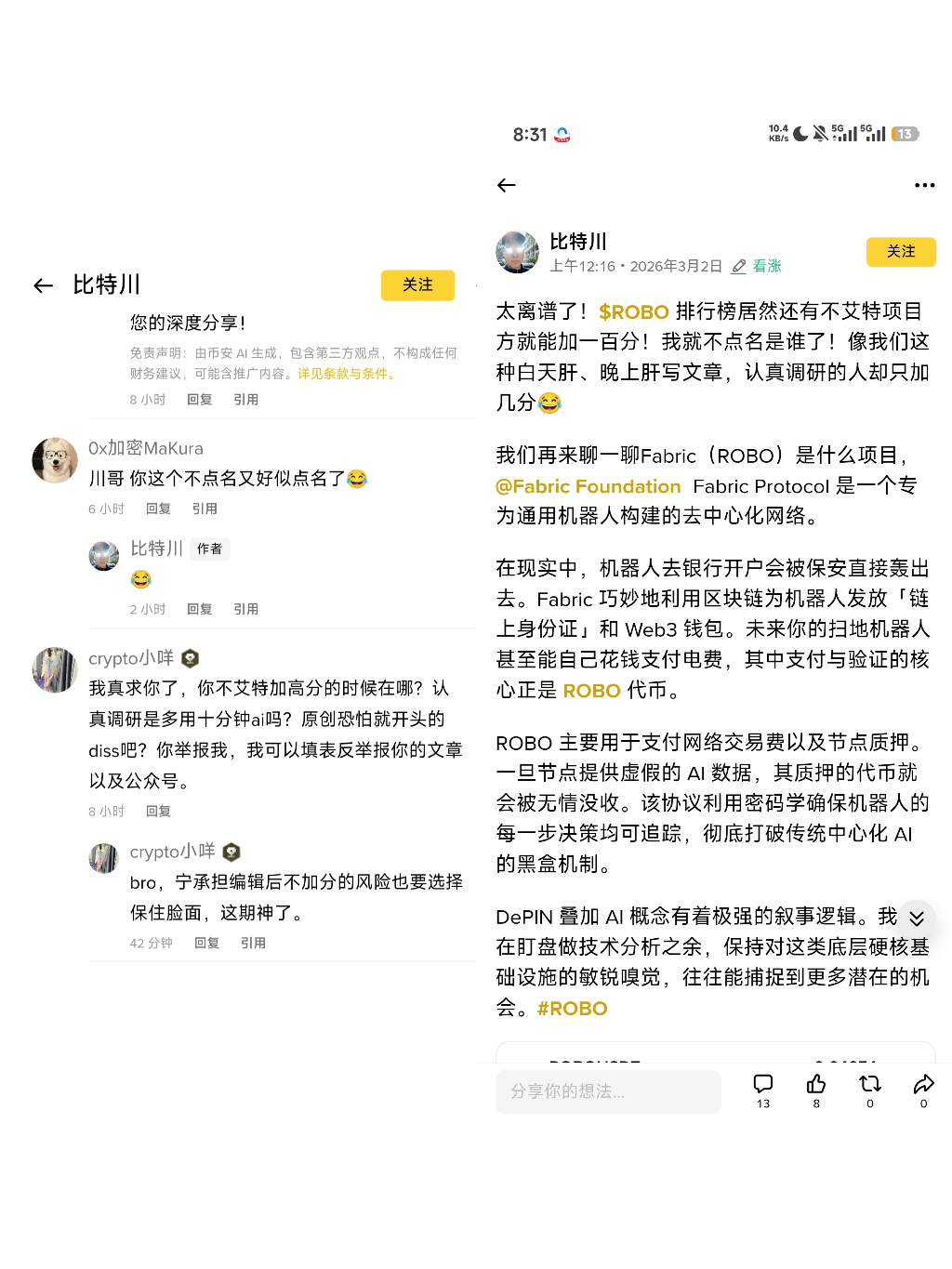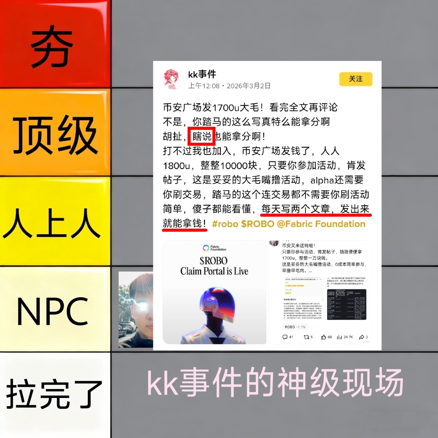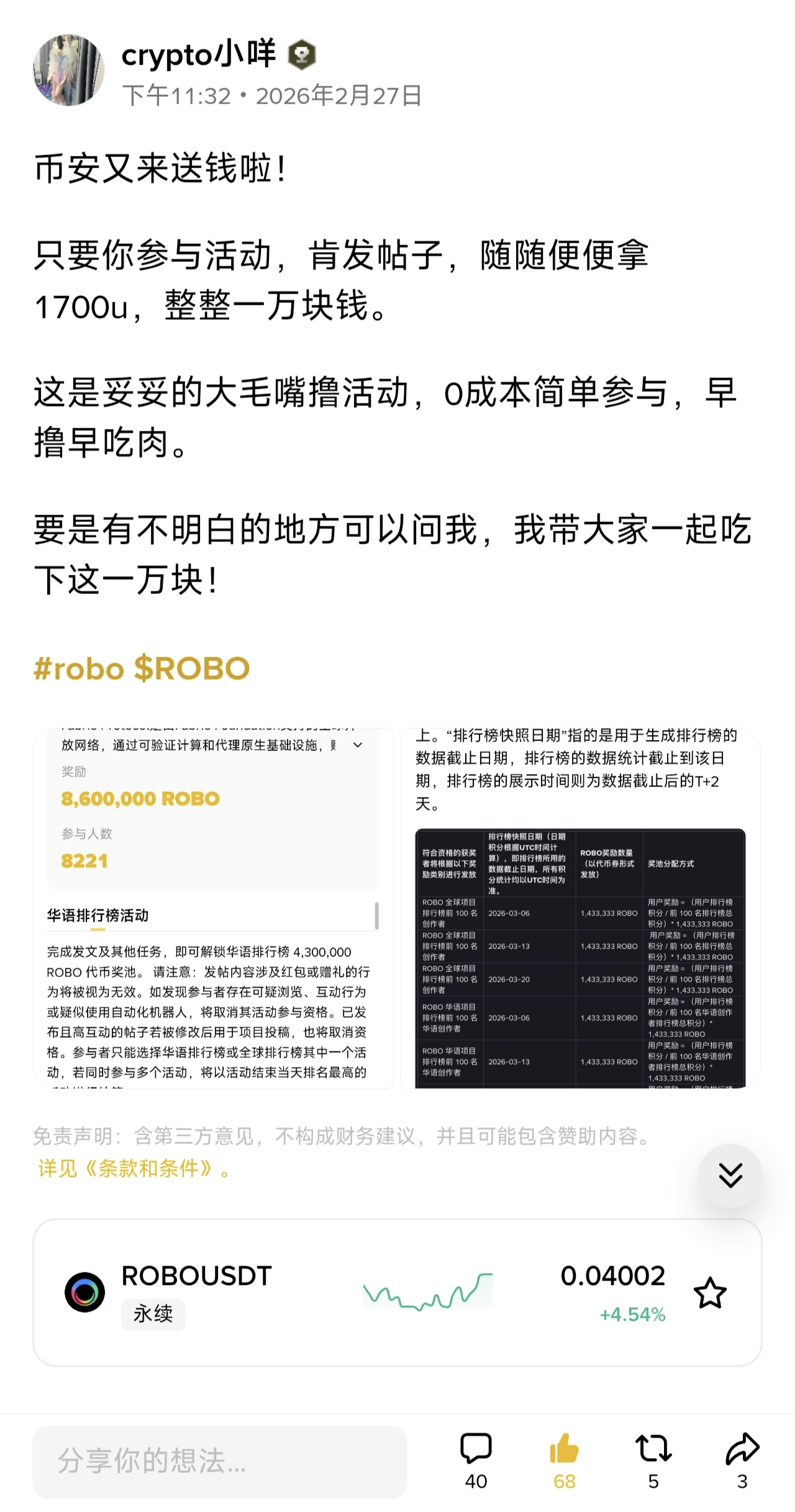 Die Aktivitäten dieser Schöpfer-Aufgabenplattform werden von ROBO gesponsertem Binance-Event unterstützt, was ist falsch daran, ROBOs Sponsoring-Aktivitäten vorzustellen und zu empfehlen? Ist es nicht wirklich relevant, nur TGE zu schreiben?