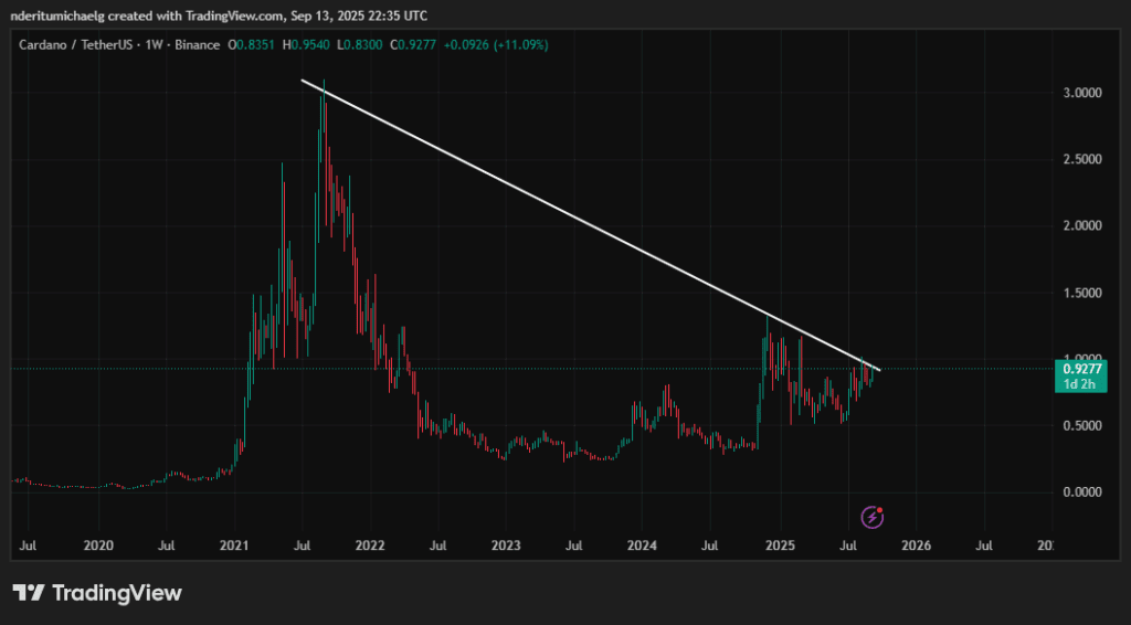 Der Preis von ADA stieg im wöchentlichen Zeitrahmen um etwa 8 %. Diese Aufwärtstrend hat jedoch auch erneut eine langfristige abwärtsgerichtete Trendlinie getestet. Ein Durchbruch über diese Linie könnte den Beginn eines bedeutenden Anstiegs von ADA markieren.