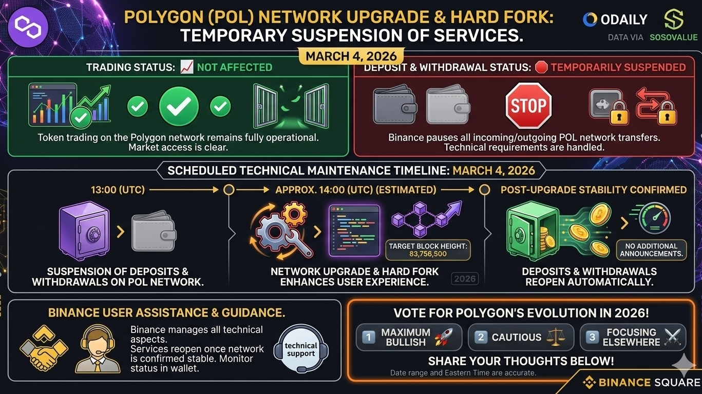 Achtung #Polygon-Inhaber und -Händler! Binance hat gerade eine vorübergehende Aussetzung der Dienste für das POL (Polygon)-Netzwerk angekündigt, um ein bevorstehendes Netzwerk-Upgrade und einen Hard Fork zu ermöglichen.