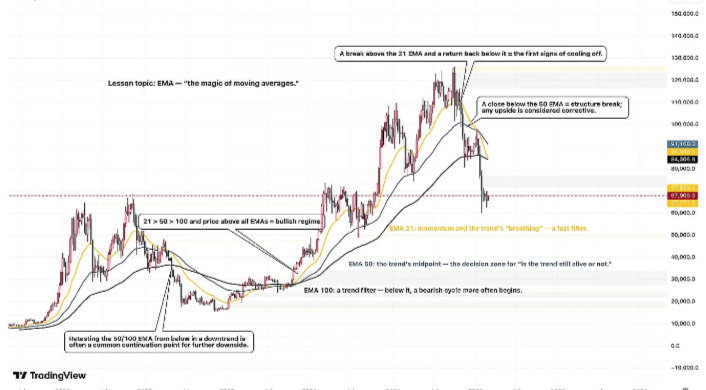 EMAs don't give entry triggers by themselves â they give you the big-picture context. The actual entry comes from key levels plus price reaction. In bullish regime, look for confirmed bounces off the 21 or 50. In transition, watch if the 50 holds. In bearish regime, wait for retests of the 21/50/100 from below and see if sellers show up strong.