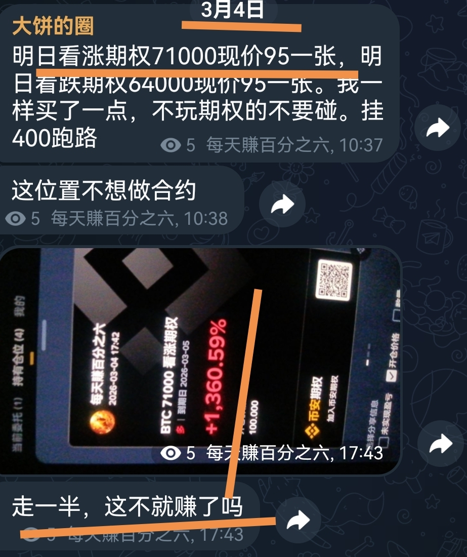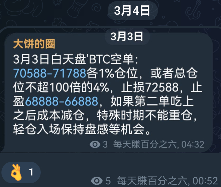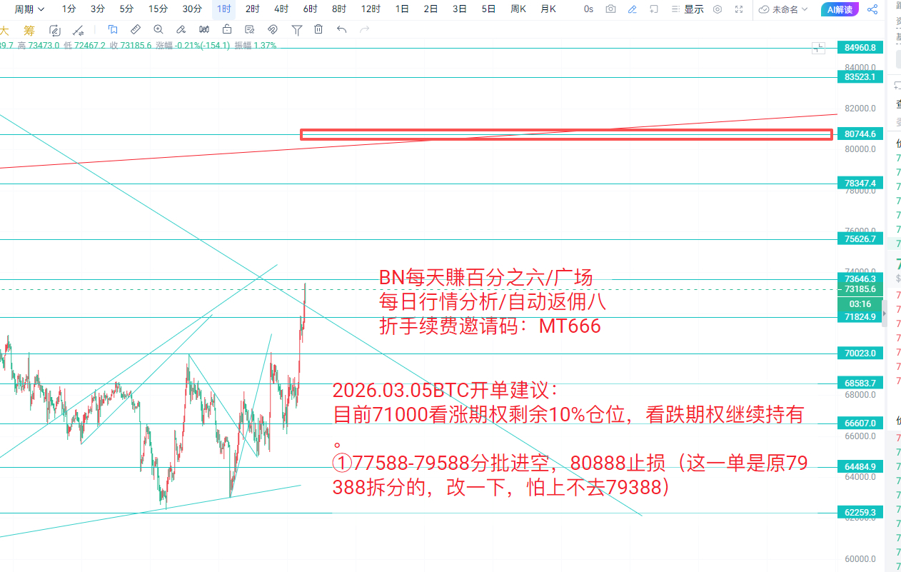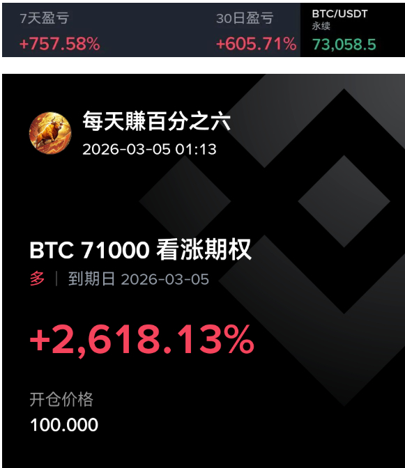 现在是2026.03.05凌晨0:08分,BTC在昨日中午(UTC-8)67350开启强势反弹,目前最高点为73500,涨幅9%+。合约方面我们70588-71788的空单在71188均价减仓后没有及时止盈,因美股开盘后的上涨行情在72588被止损,即使使用2%仓位,浮亏为账户金额的4%(图三);昨日上午10点睡前安排的3月5日交割的71000看涨以及64000看跌两单对冲期权(图四),由于行情大幅上涨的原因,看涨期权在傍晚醒来时价格已到1430,于1430止盈50%,晚间继续上涨至2100+再次止盈40%,目前今日看涨期权总落地利润为1900%,按照1%仓位计算今日期看涨权盈利为账户的19%减去看跌期权的亏损为18%。今日开单利润合计为账户的18-4=14%,不包括剩余的期权仓位价值,并且这是按照最小期权仓位盈利以及最大合约仓位亏损的情况下计算得出(剩余看涨期权价值暂时为开单前账户的2.5%+,目前盈利2600%)。