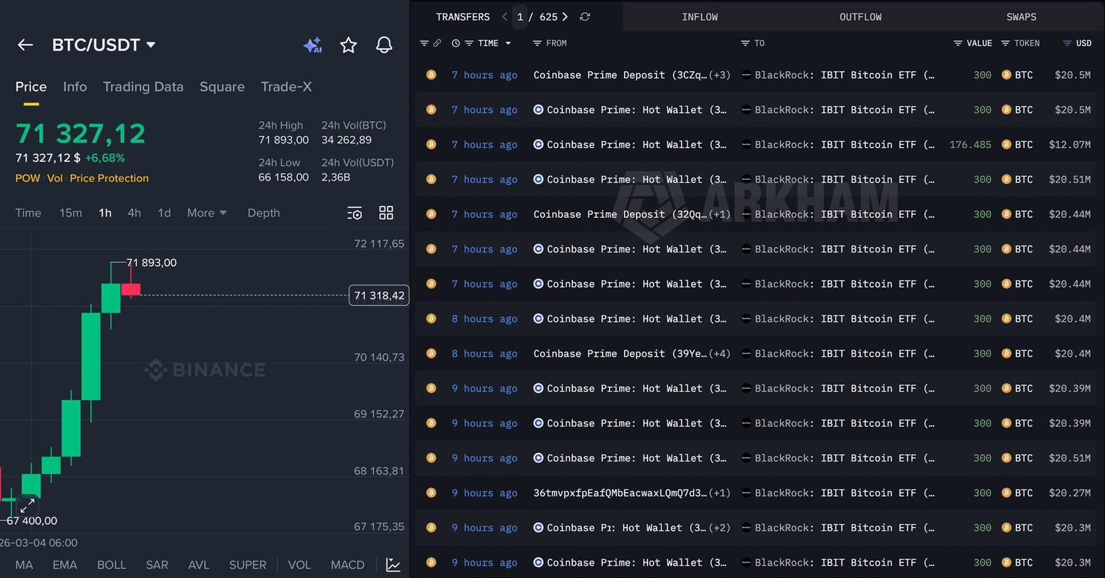2. Im Coin-Transfer-Log sieht man Coinbase Prime → BlackRock IBIT kontinuierlich in Chargen von ~300 BTC.