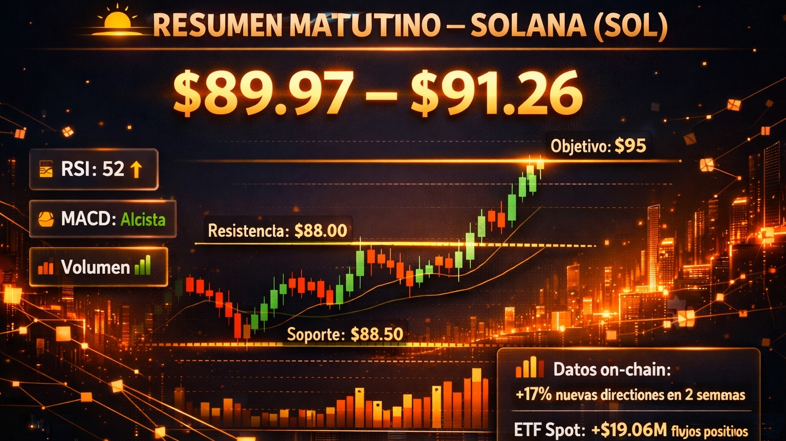 Solange SOL den Support von $88.50–$90.00 mit Volumen hält, ist der Trend positiv mit einem sofortigen Ziel von $95. Ein nachhaltiger Durchbruch über $100 mit Stärke könnte die Bewegung in Richtung $108–$112 beschleunigen. Die kurzfristige bullishe Struktur ist klar, nachdem $88 überschritten wurde, obwohl der MACD eine gewisse Verlangsamung zeigt, die eine Konsolidierung vorwegnehmen könnte.