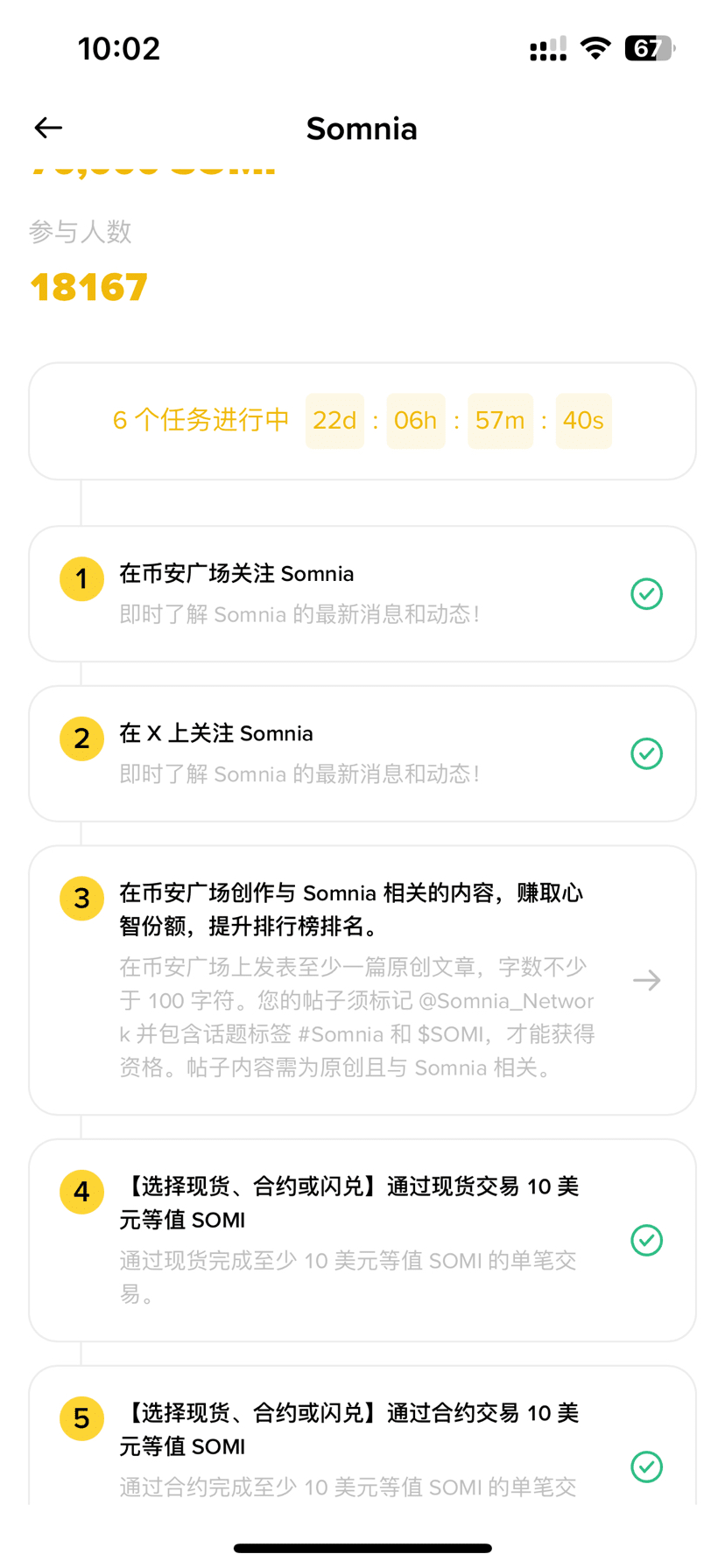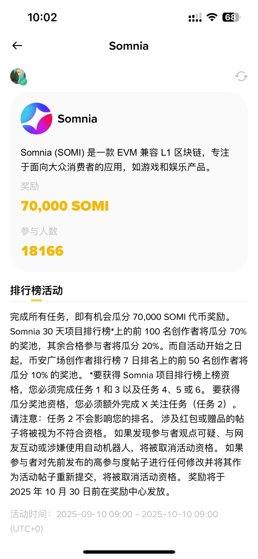 📣 Null Eintrittsbarriere, holt euch das Somnia Guthaben! Nur 0.3 Dollar Kosten, einfache Aufgaben abschließen und auf die Verteilung warten! 🎯 Der Preispool ist sehr großzügig: 70.000 $SOMI warten auf euch~ 🌟 Die Top 100 im Ranking erhalten 70%, die restlichen Regelkonformen erhalten weitere 20% 🚀 Die Top 50 auf Binance erhalten zusätzlich 10% Punkte! ❗ Pflichtaufgaben 1, 3 + 4/5/6 beliebig, X folgen (Aufgabe 2) muss abgeschlossen werden! 🕒 Belohnungen werden vor dem 30. Oktober verteilt, nicht verpassen~ @Somnia Official #Somnia $SOMI