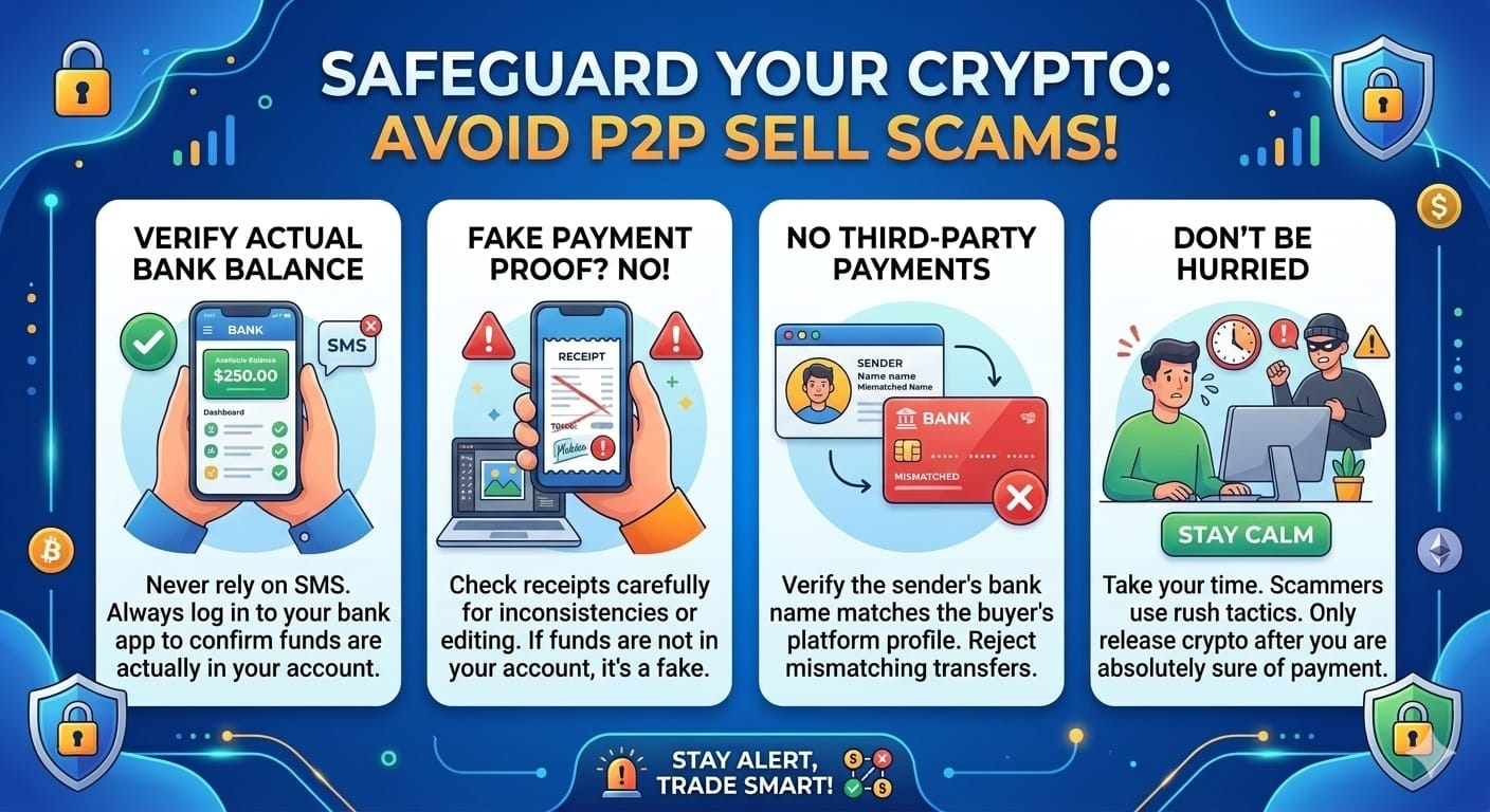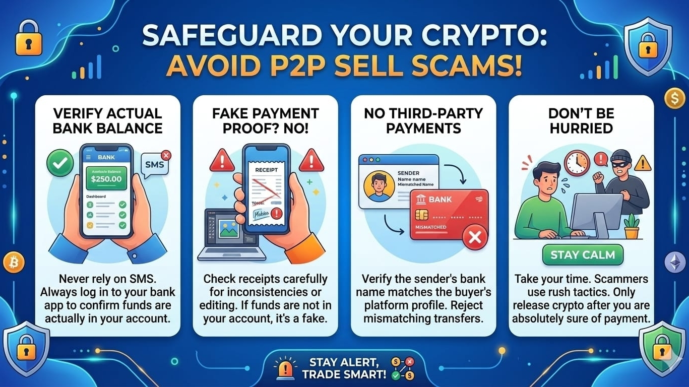 When selling crypto, scammers use fake payment proofs or "Chargeback" tactics to steal your assets. Protect yourself with these tips: 🔐