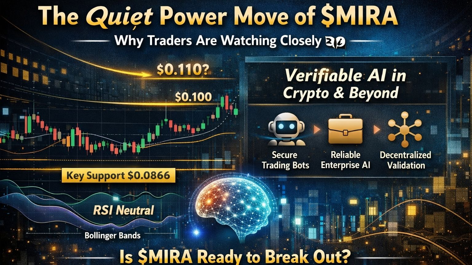 Technically, $MIRA is showing signs of strength. Support at $0.0866 is holding, large sell orders are slowing, and RSI sits neutral. Even Bollinger Bands are tightening a classic volatility squeeze, hinting that the market is coiling for the next move. Add a higher low after a recent bullish push, and the chart suggests a potential trend continuation. Key zones to watch: $0.100 and $0.110.