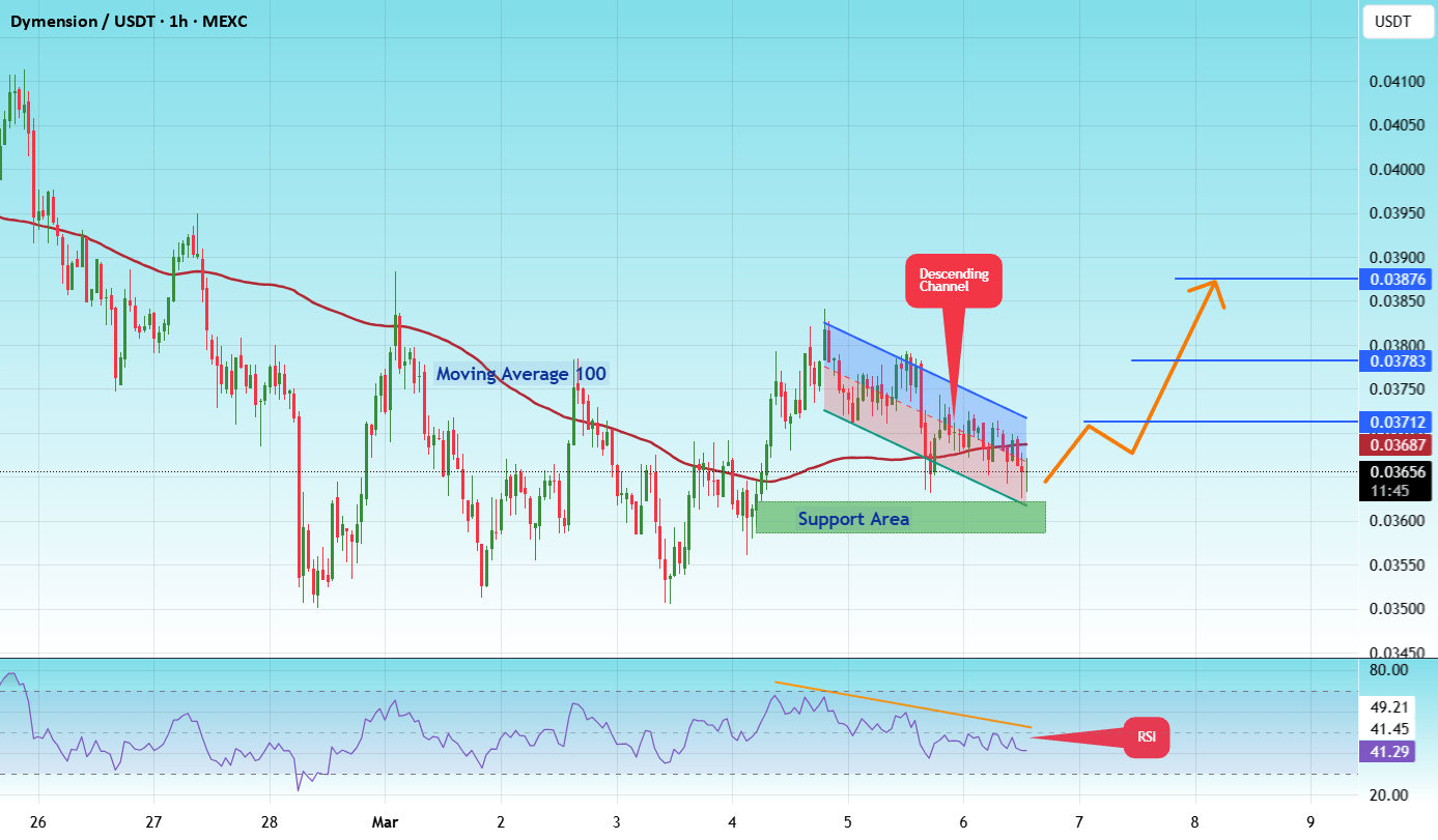 تم العثور على منطقة دعم رئيسية (باللون الأخضر) عند 0.03600، وقد ارتد السعر عن هذه المنطقة عدة مرات، مما يجعلها مستوى دعم قوي.