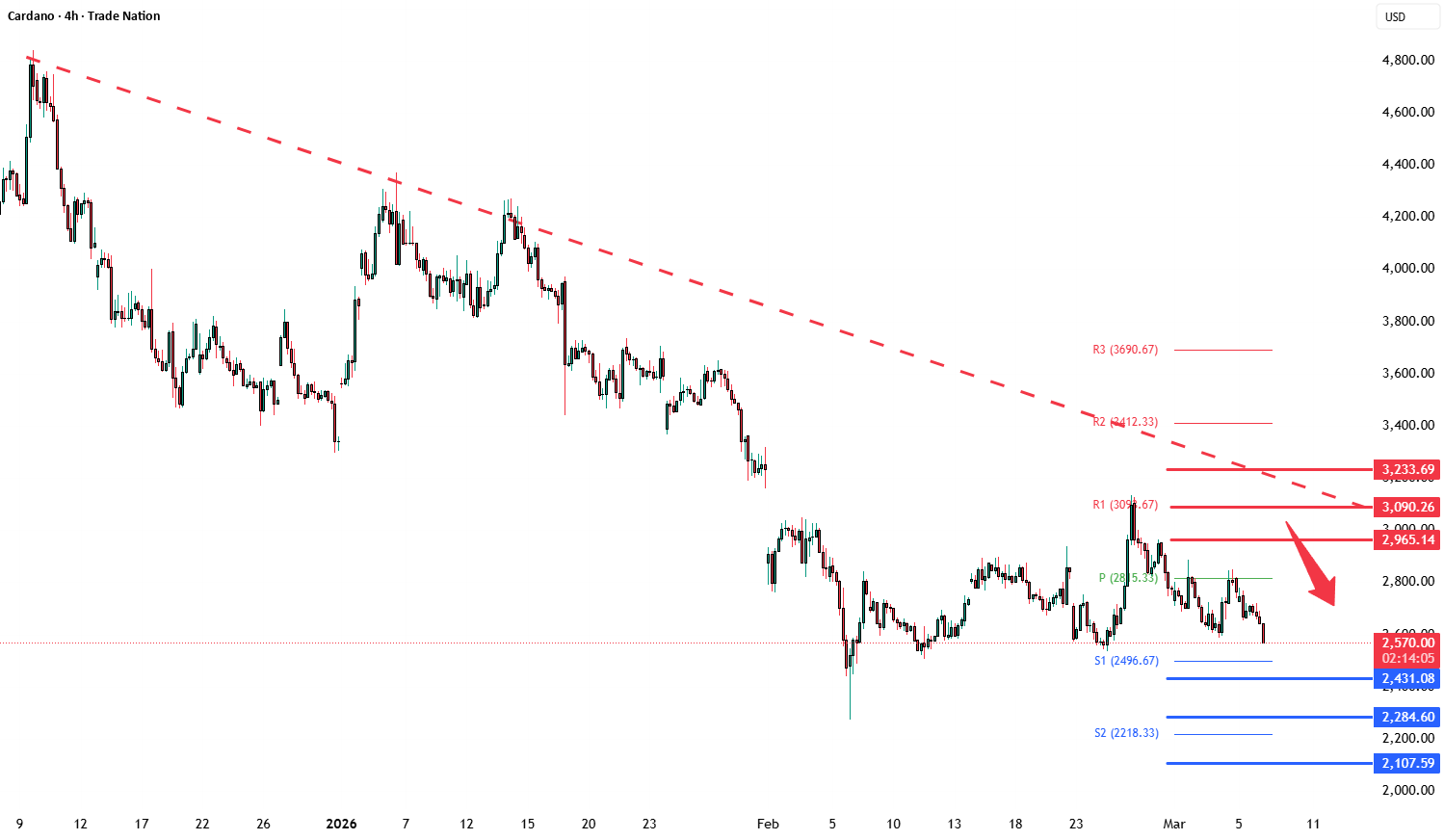 تظل ADAUSD تحت ضغط هبوطي، مع مستوى 2962 يعمل كنقطة تحول رئيسية. طالما أن السعر يبقى تحت هذا المستوى، فإن الميل يفضل المزيد من الهبوط. يجب على المتداولين مراقبة تأكيد السعر حول هذا المستوى لتقييم الخطوة التالية.
