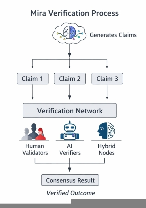Hier beginnt der Ansatz des Mira-Netzwerks, konzeptionell Sinn zu machen. Anstatt sich auf eine einzige Autorität oder ein einzelnes Modell zu verlassen, verteilt es die Verifizierung über ein Netzwerk von Teilnehmern, die Ansprüche gemeinsam bewerten.