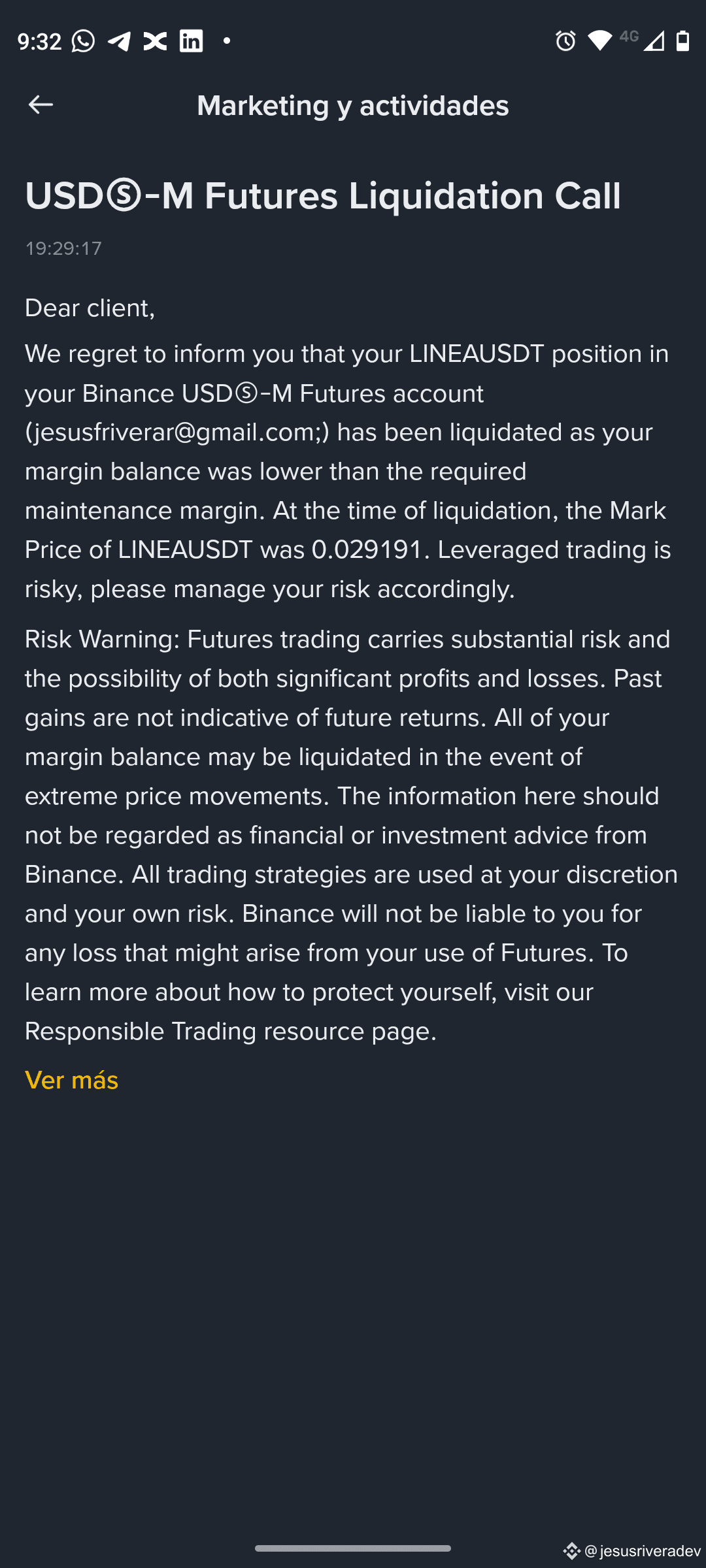 4. Llegaste al "Precio de Liquidación": Tu margen restante se volvió inferior al "margen de mantenimiento" (el mínimo requerido para mantener la posición abierta). En el momento exacto en que el "Precio de Mark" (un precio de referencia justo) de LINEA llegó a 0.029191 USDT, el sistema de Binance actuó automáticamente.