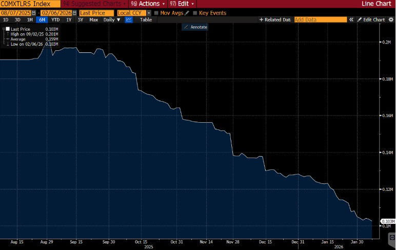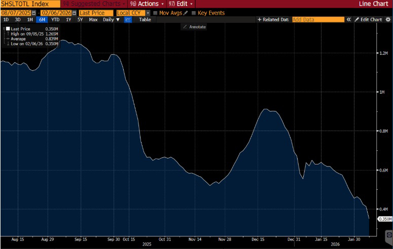 COMEX silver inventories continue to decline, reinforcing the view that physical supply remains tight despite the recent price correction.