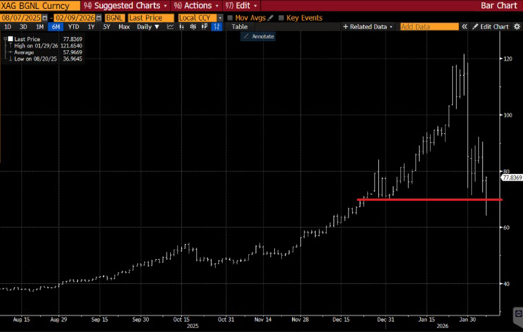 After the recent liquidation-driven decline, silver appears to be forming a higher structural base around $70 as leverage has been reduced and physical tightness persists.