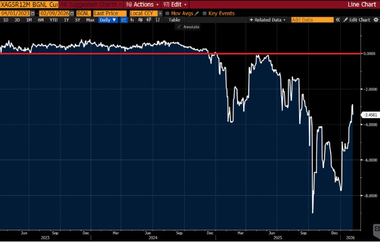 The one-year silver swap relative to U.S. interest rates has moved deep into backwardation, indicating strong demand for immediate physical delivery.