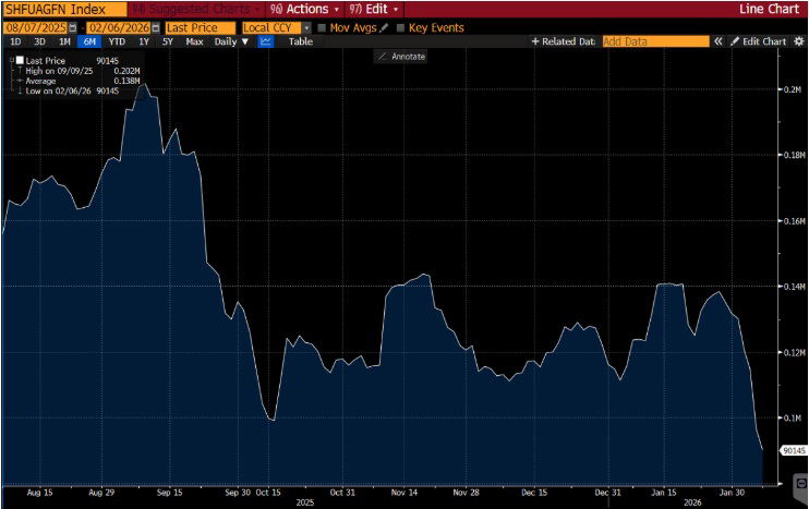 Open interest in Chinese silver futures shows the same pattern as COMEX, confirming that the recent decline was driven by liquidation of leveraged positions rather than weakening physical demand.