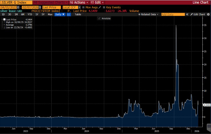 One-month silver lease rates in London have surged far above normal levels, a clear sign of tight physical availability in the spot market.