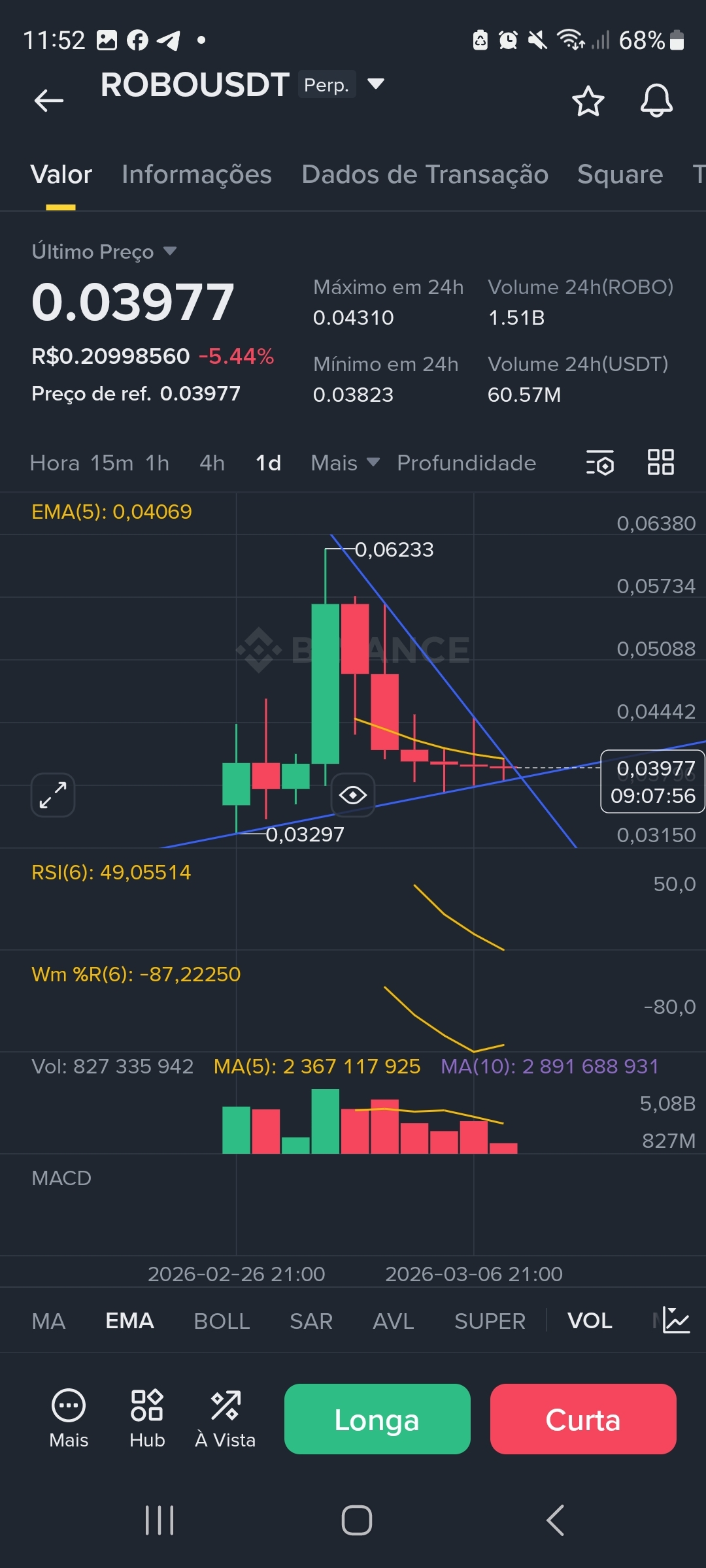 * Gráfico Diário (1D): O ativo apresenta uma forte correção após o topo em 0,06233. Atualmente, testa uma linha de tendência de alta (LTA) de longo prazo e a região de suporte próxima a 0,03823 (mínima de 24h). O RSI(6) em 49,05 indica neutralidade, saindo de uma zona de sobrevenda anterior.